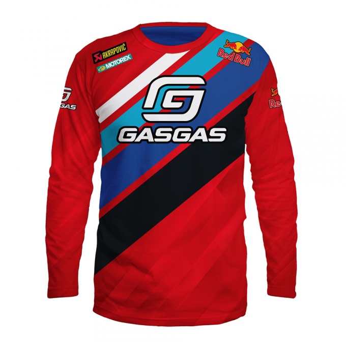 • Gasgas, Akrapovic, Motorex and Red Bull logos on the back