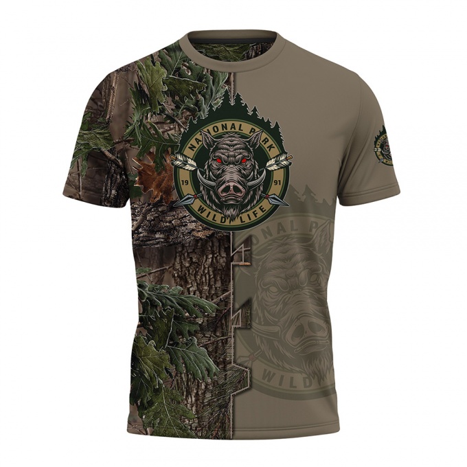 Hunting Short Sleeve T-Shirt Wild Boar Half Forest Full Color Print