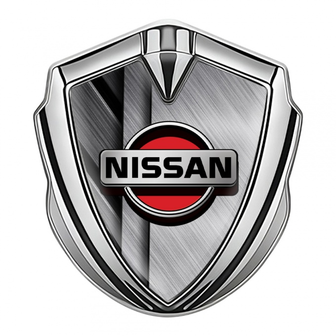 Nissan Domed Badge Silver Brushed Aluminum Effect Red Logo Design