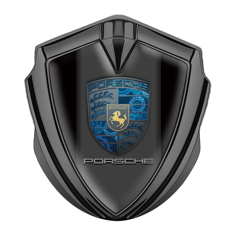 Porsche Fender Emblem Badge Graphite Black Base Pilon Electric Blue Cogs