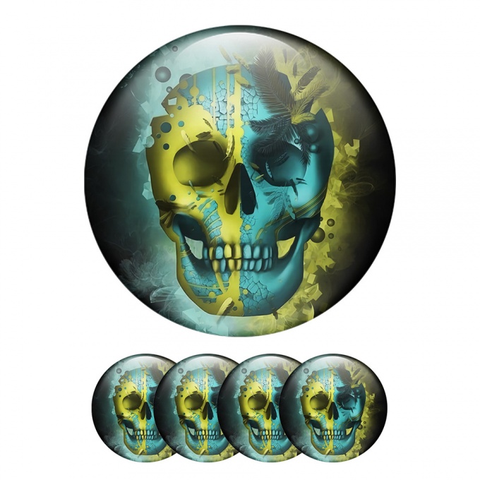 Skull Wheel Center Cap Domed Stickers Two-Tone Front In Yellow And Blue