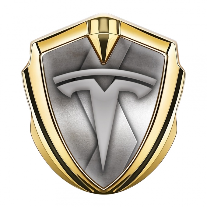 Tesla 3D Car Metal Domed Emblem Gold Curved Plate Grey Logo